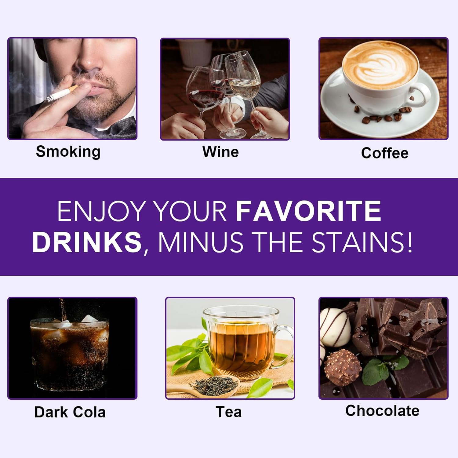 Utilizes purple color technology to instantly neutralize yellow tones on teeth, revealing an immediate whitening effect.